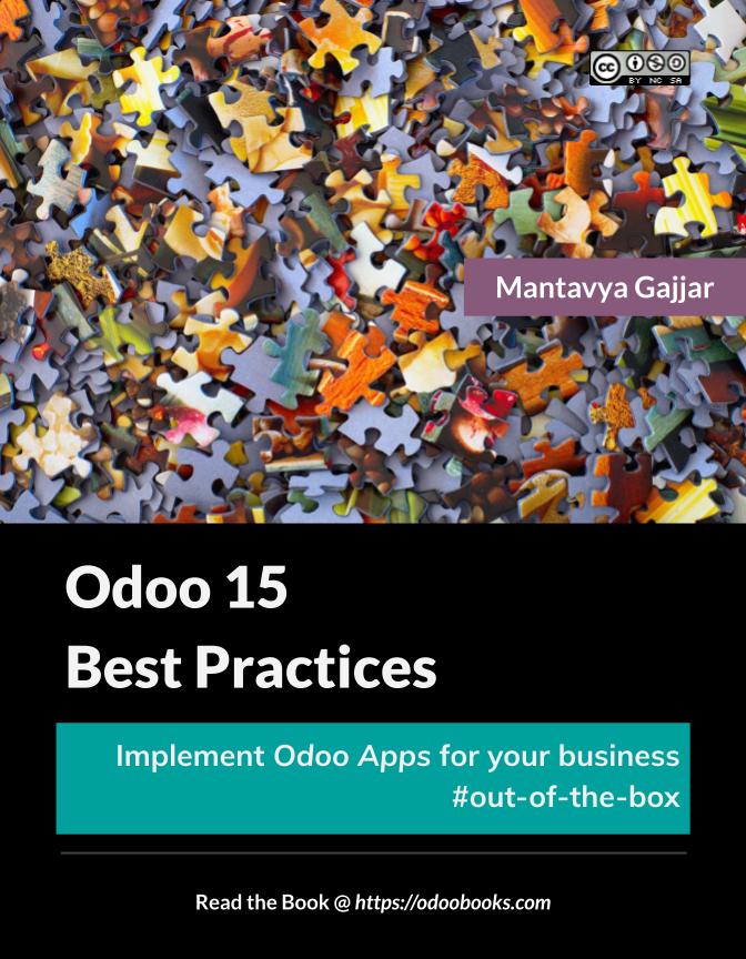 Odoo 15 Best Practices Book is an online book written based on Community and Enterprise Edition. This book covers best implementation practice for most used applications such as Sales, Purchase, Inventory, Financial Accounting and Manufacturing.