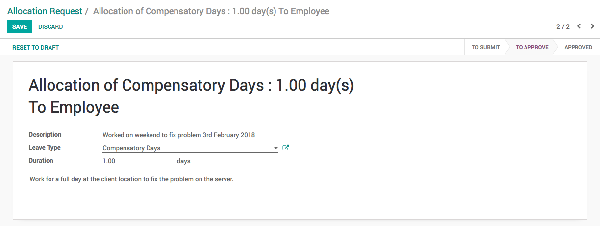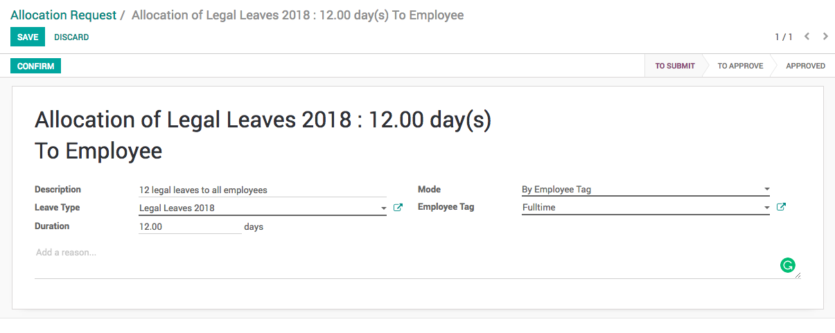 By default the leave allocation will be in draft, it has to be requested for the approval, click on CONFIRM button to ask for the approval, HR Manager have the rights to approve the allocation request.