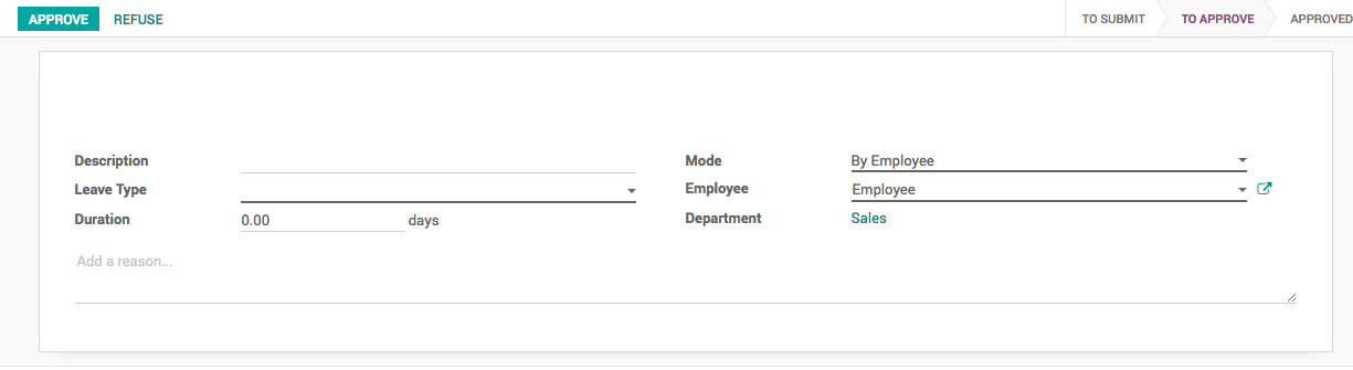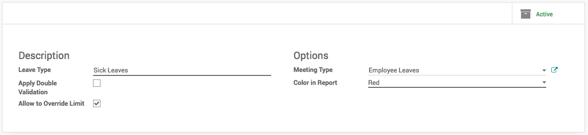 Meeting Type: Once a leave is validated, Odoo will create a meeting of this type on the correspondent calendar.
