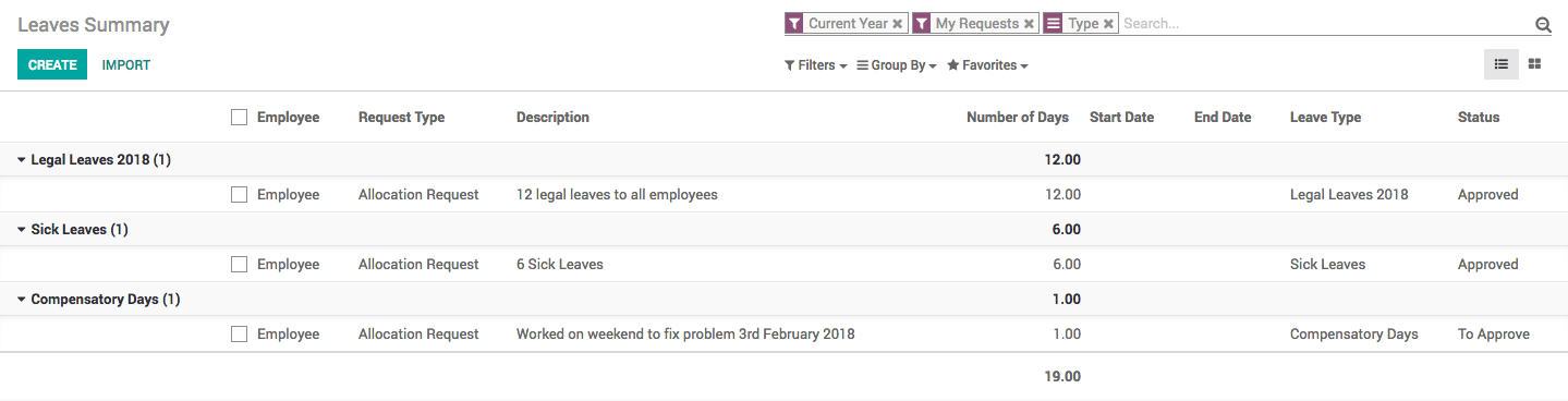 Default leave types are already given in the Odoo as a standard data, however you can create more if needed according to your business case.